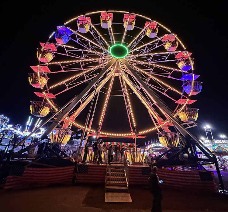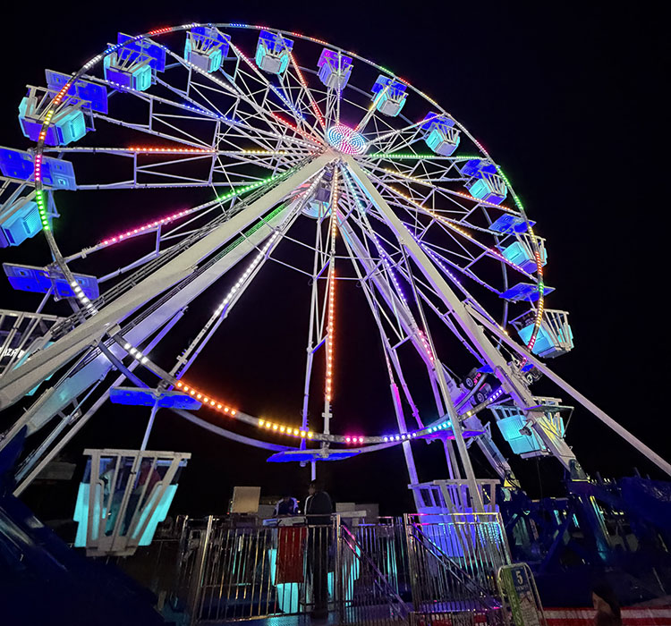 Our new giant wheel has gondola cars that light up. It is a respectable 48′ tall ride that can be seen for miles. Each gondola can seat 4 comfortably, and goes slowly toward the clouds for you to dream about fun!